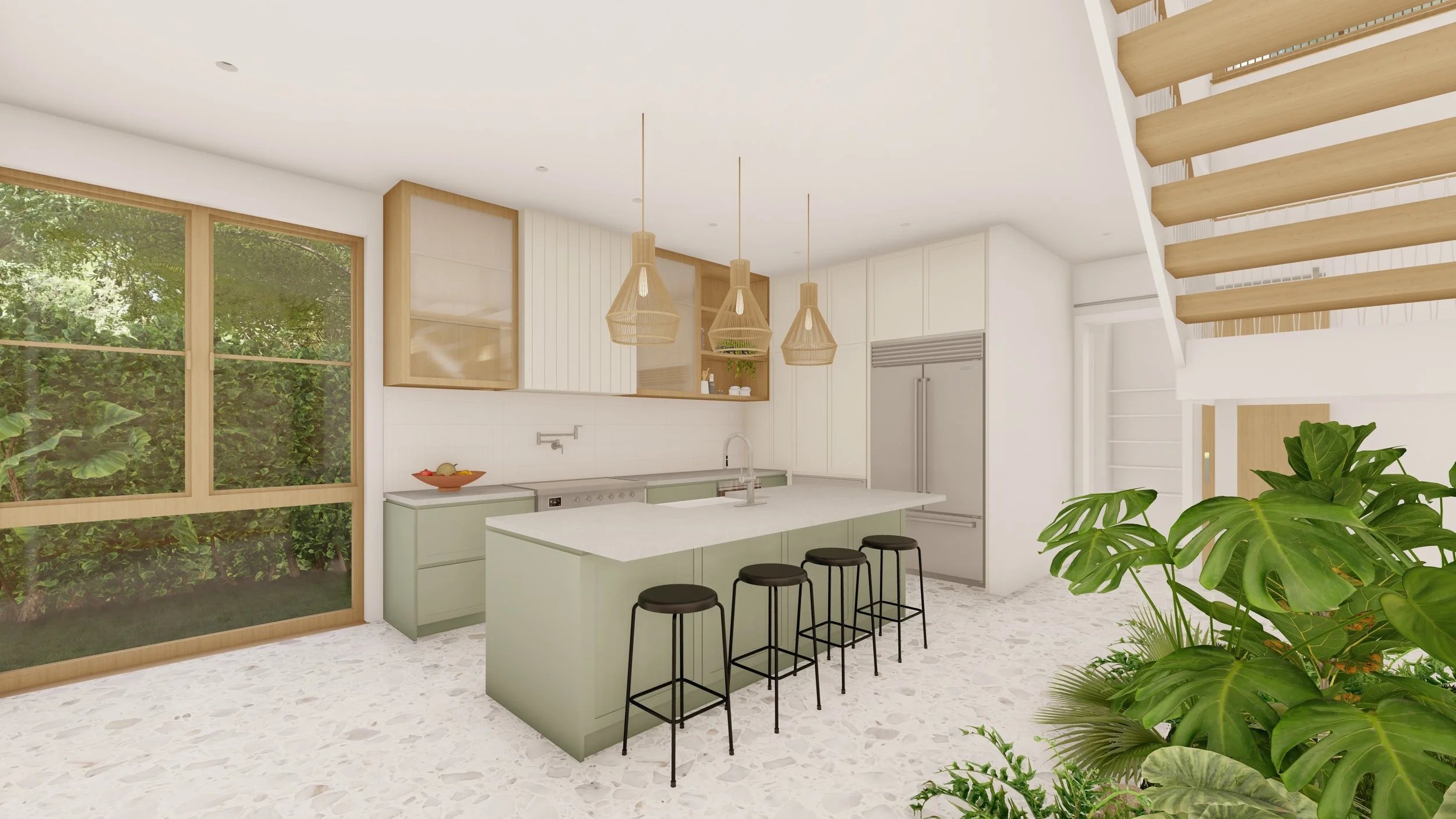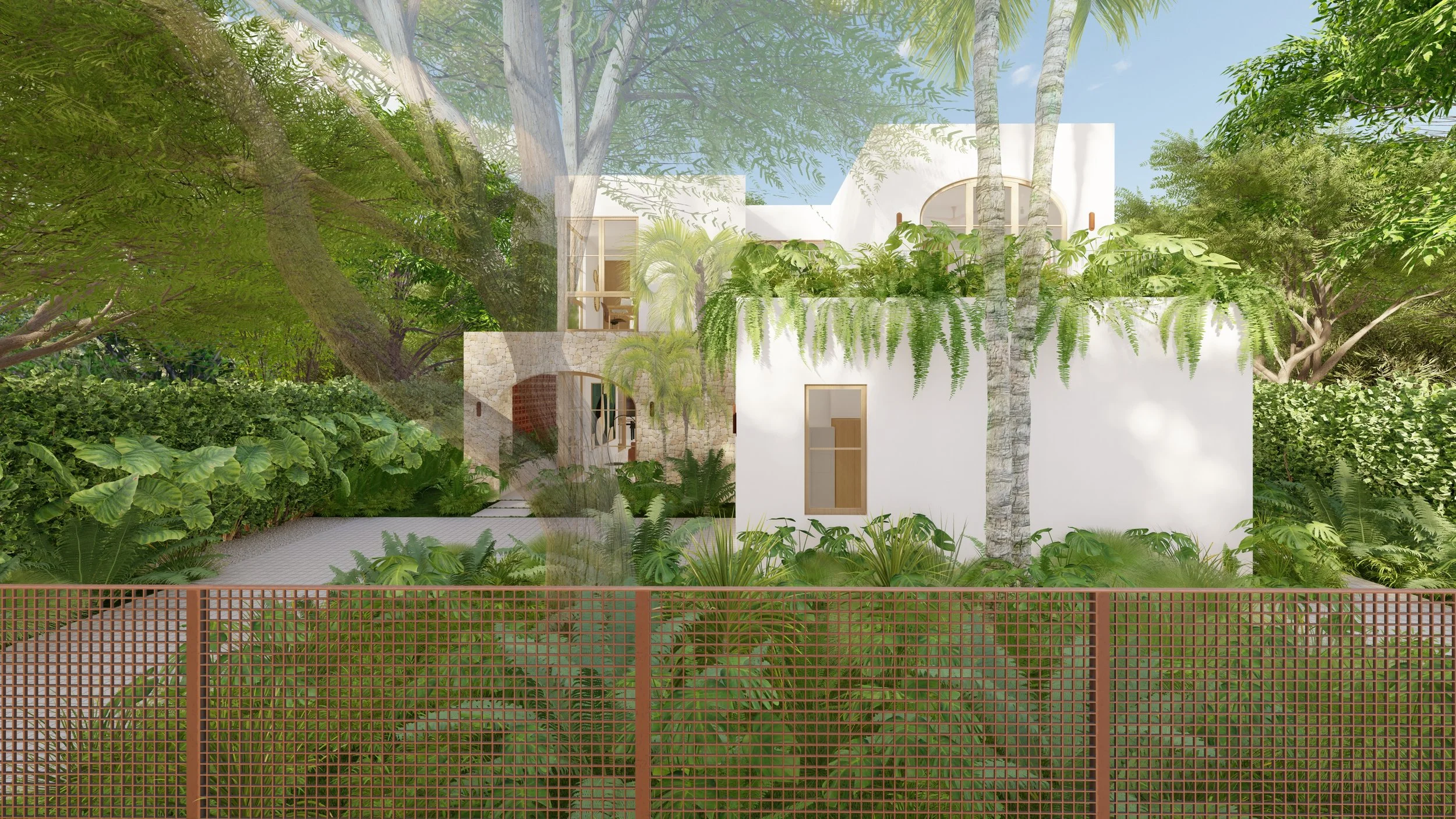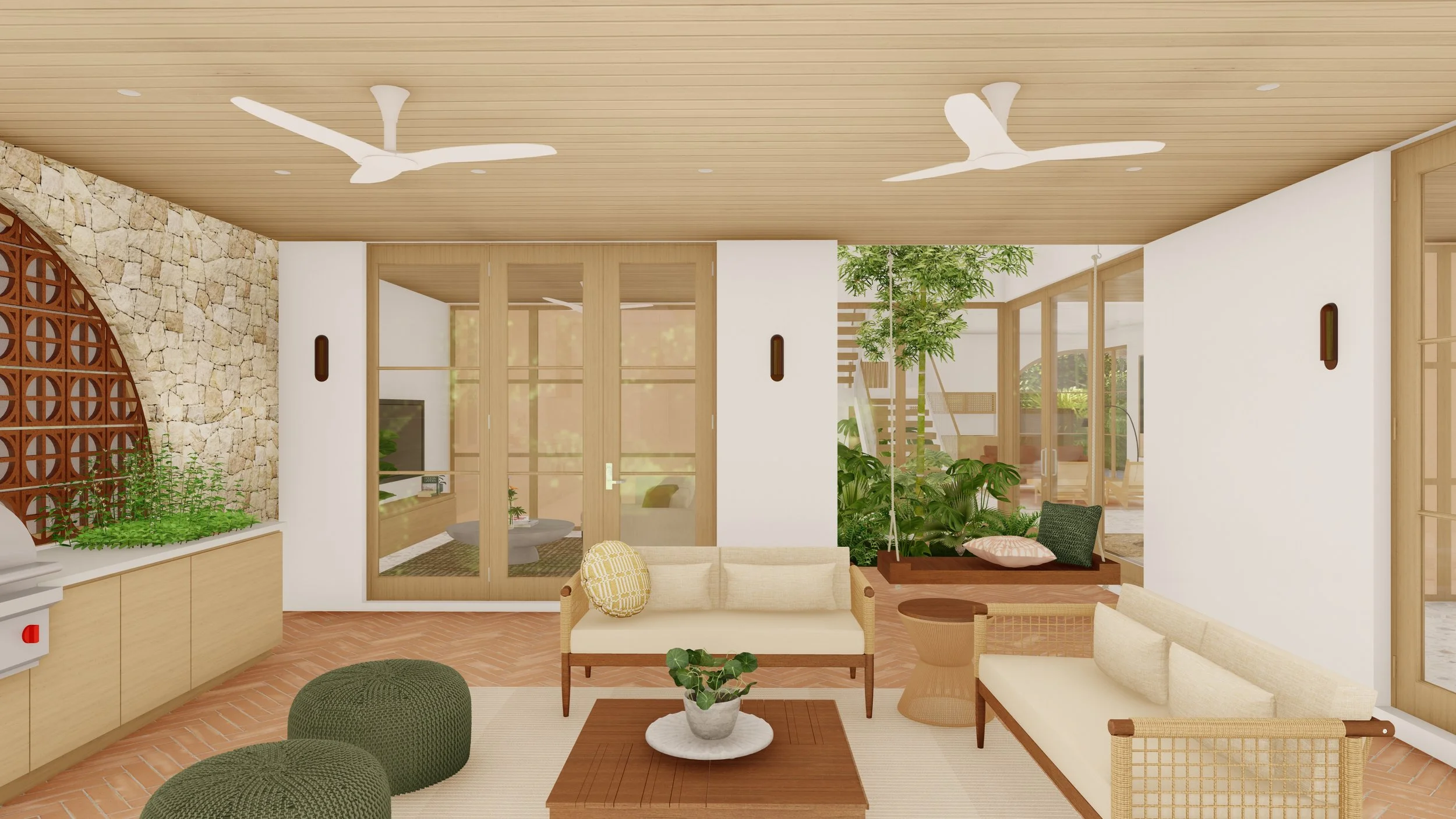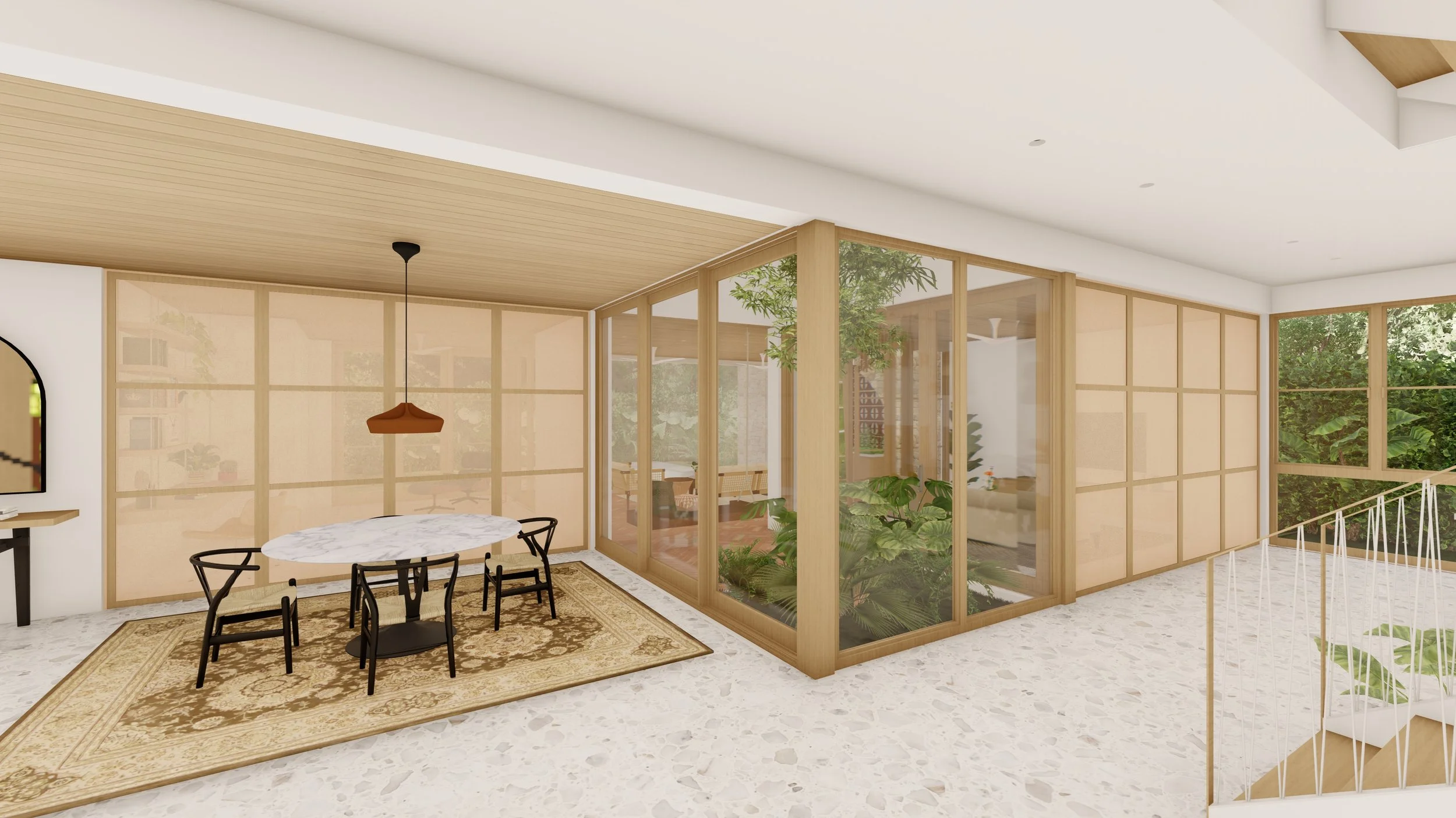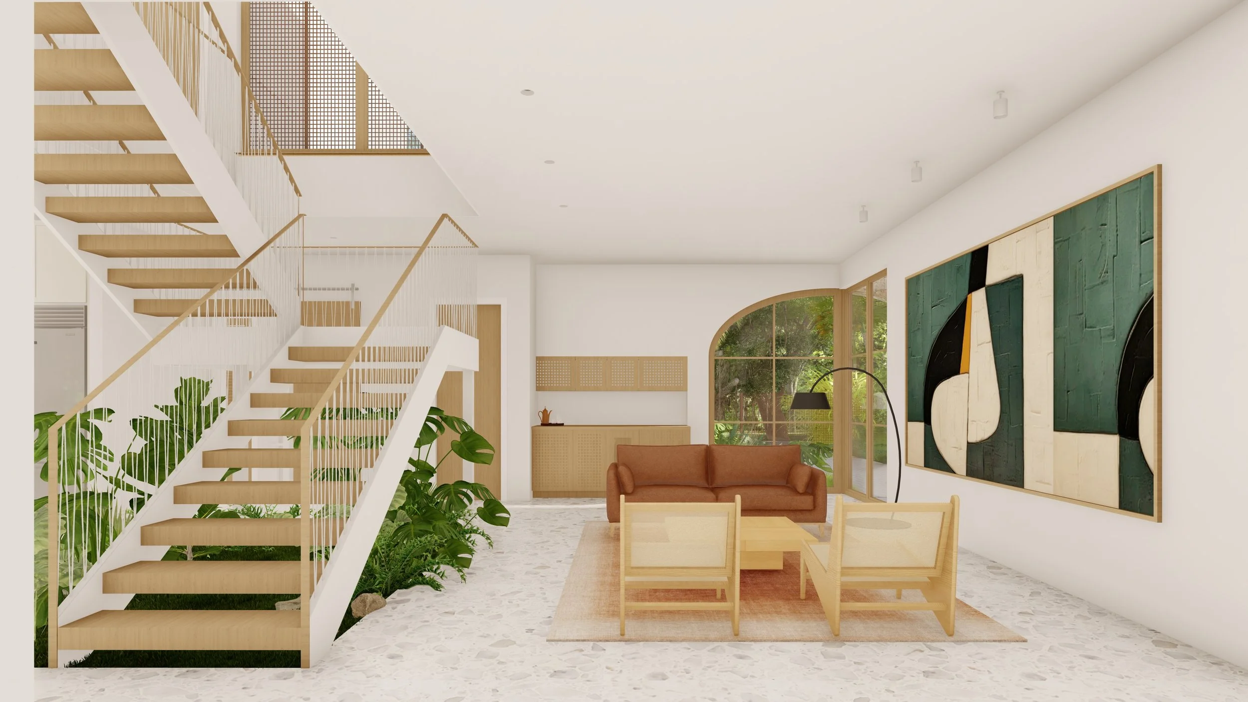 This bespoke home design centers on comfort and a strong connection to nature, tailored specifically to the clients' vision. Textured screens throughout the house allow gentle breezes to flow, creating cross ventilation that enhances the natural ambiance. A skylight in the stairwell fills the circulation spaces with soft, natural light, keeping them airy and open. Thoughtfully chosen textures and warm colors add layers of coziness, aligning with the clients’ desire for a custom, inviting retreat. Every detail in this home is crafted to offer a harmonious blend of light, nature, and comfort.