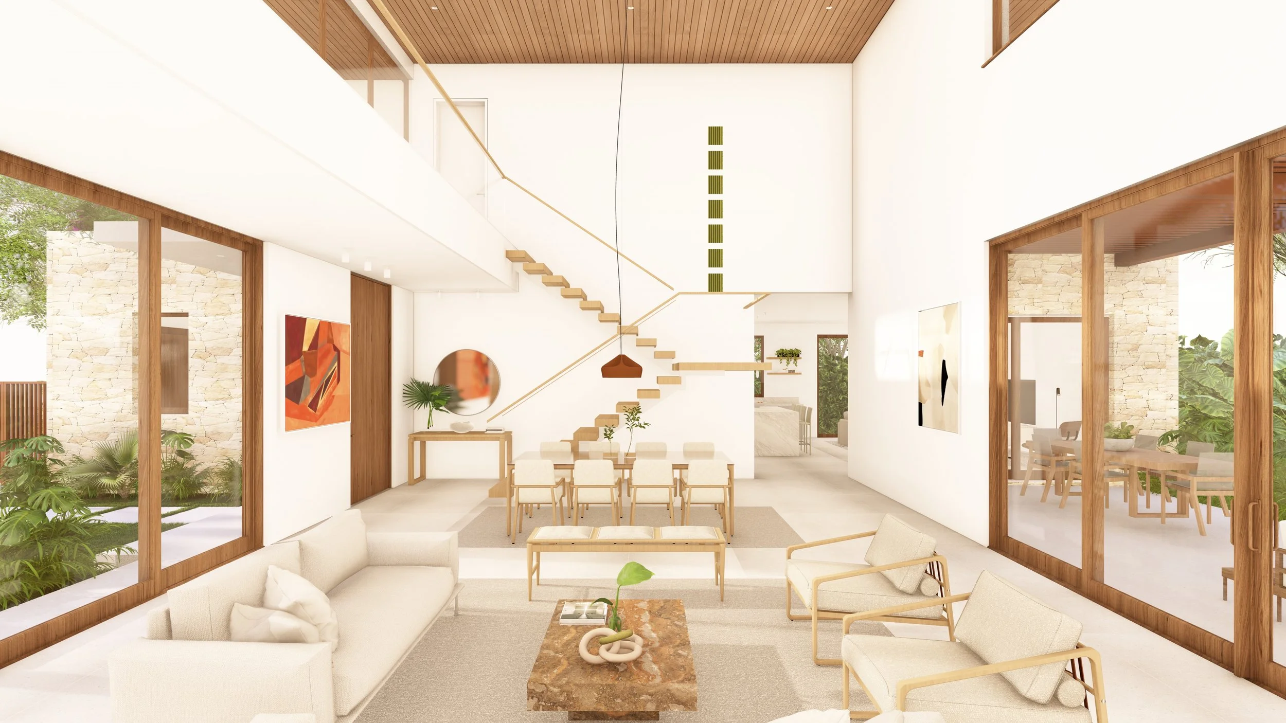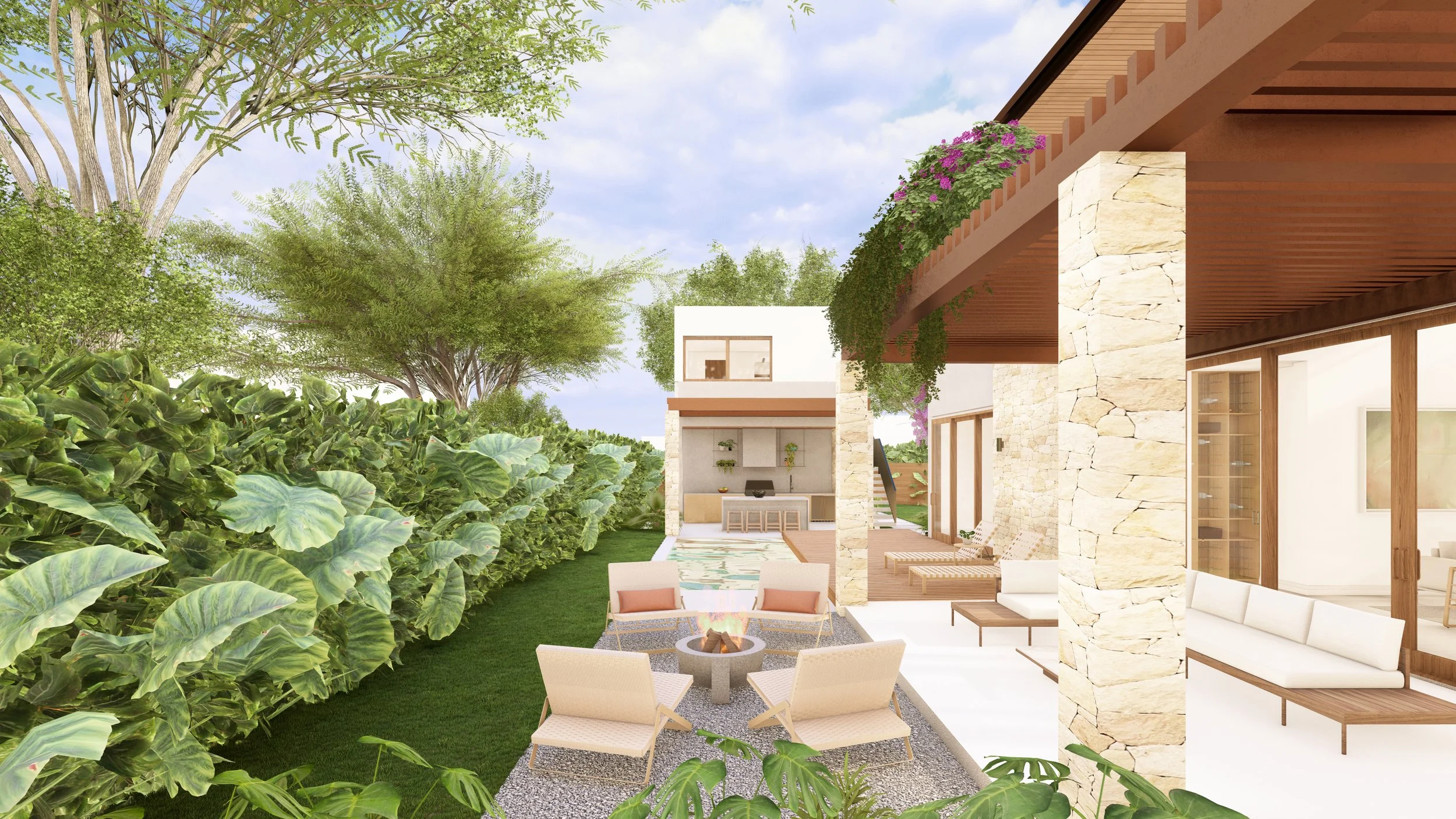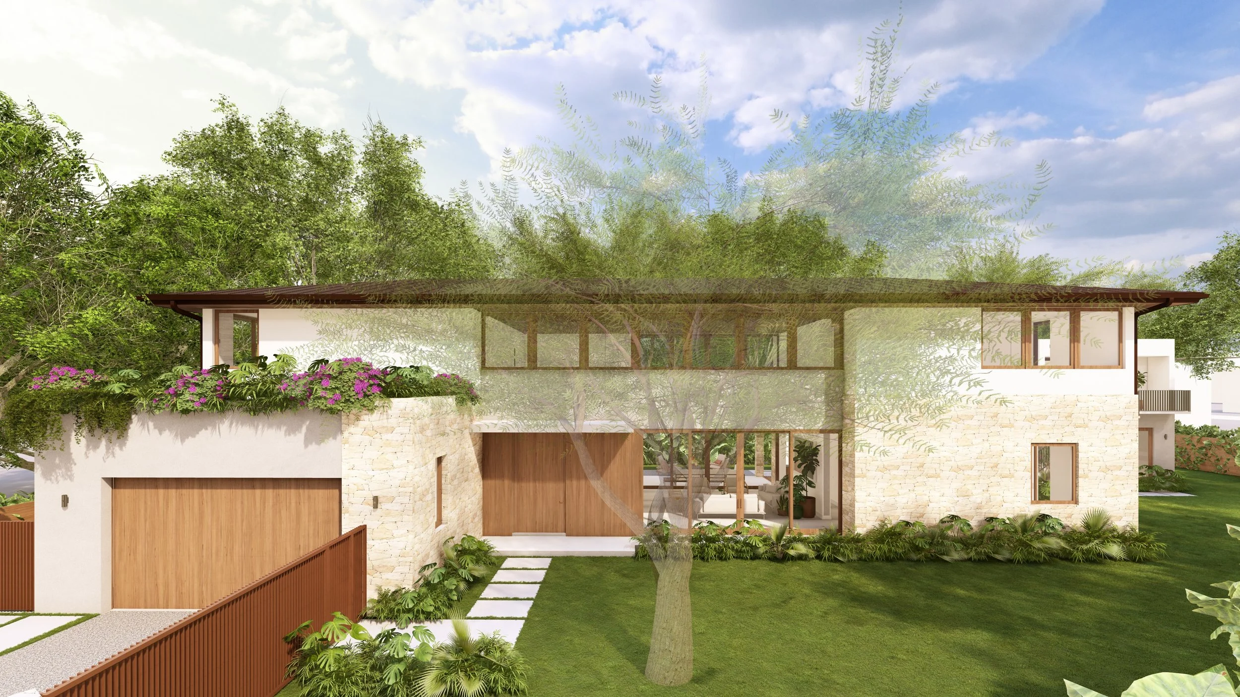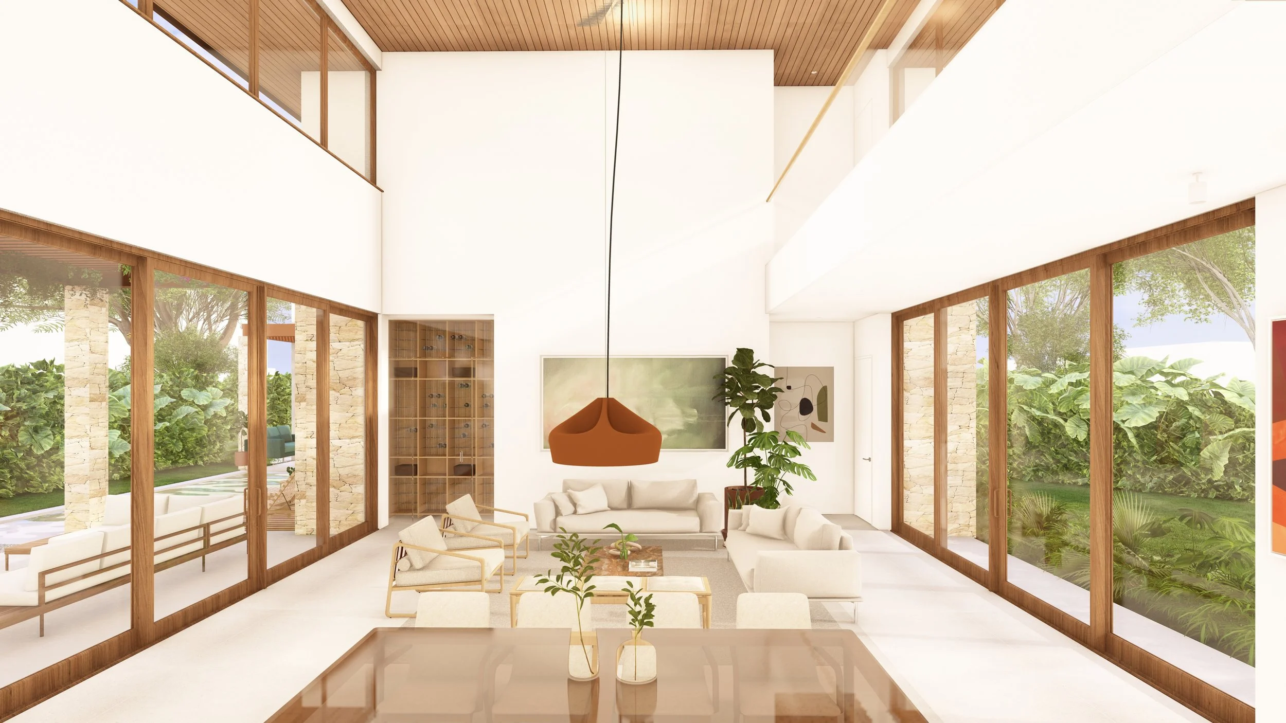 Floor-to-ceiling windows, sliding glass walls, and integrated planters blur the boundaries between interior and exterior spaces. Courtyards and shaded terraces foster a continuous flow with nature, while providing shading and comfort in the Miami tropical climate. The design prioritizes sustainability and integrates the home within the site’s natural topography, creating a tranquil and cohesive living environment.