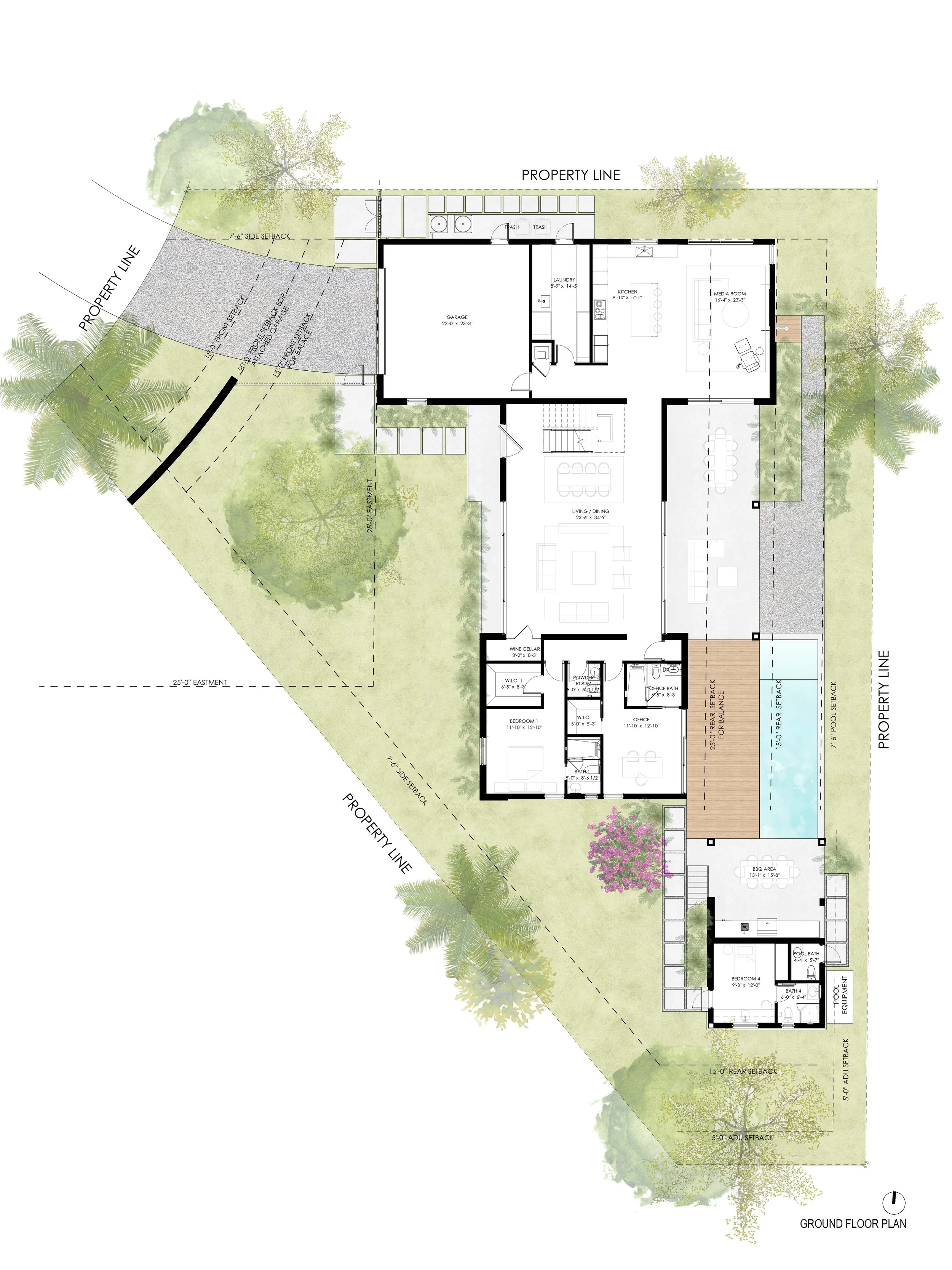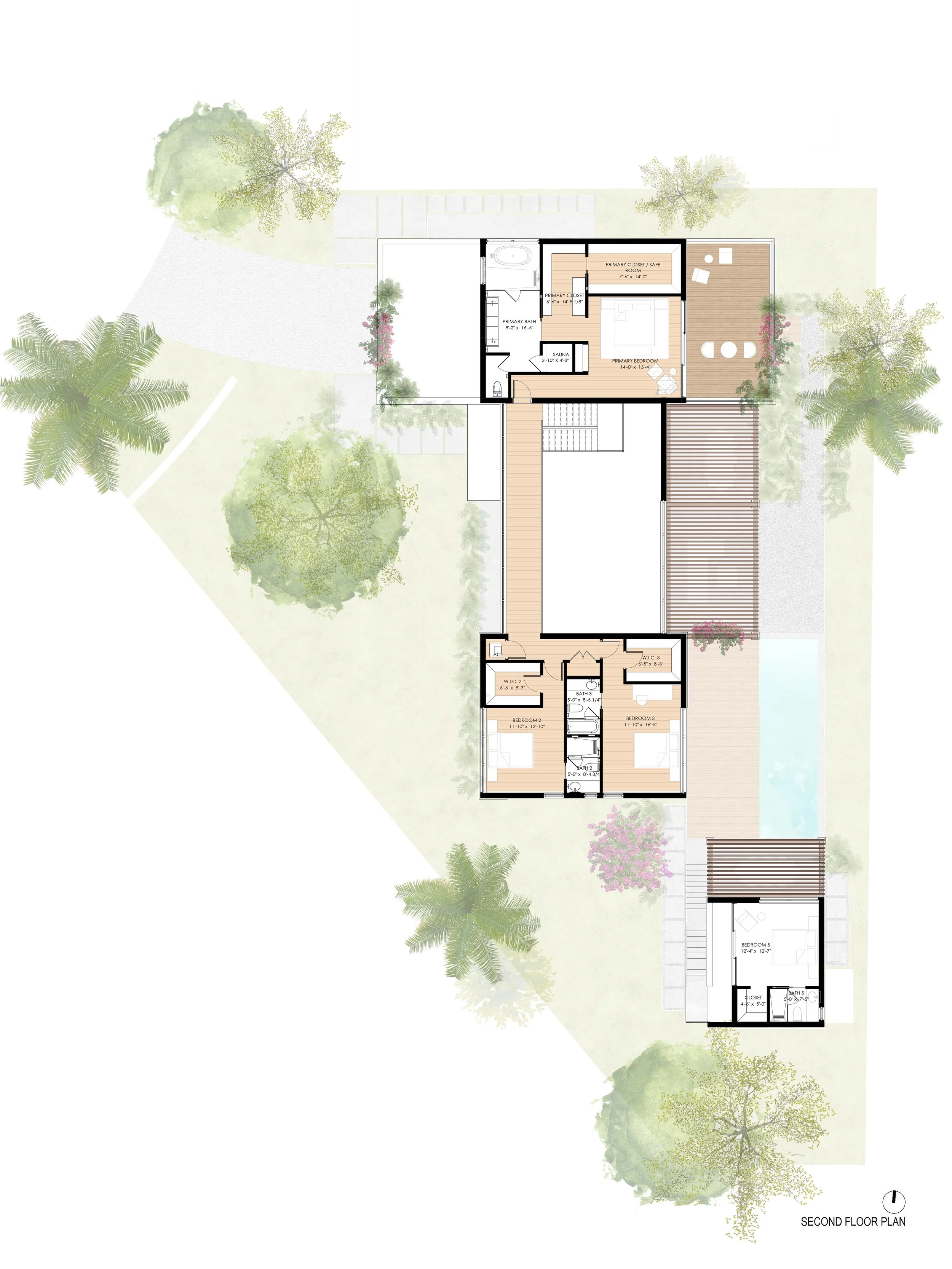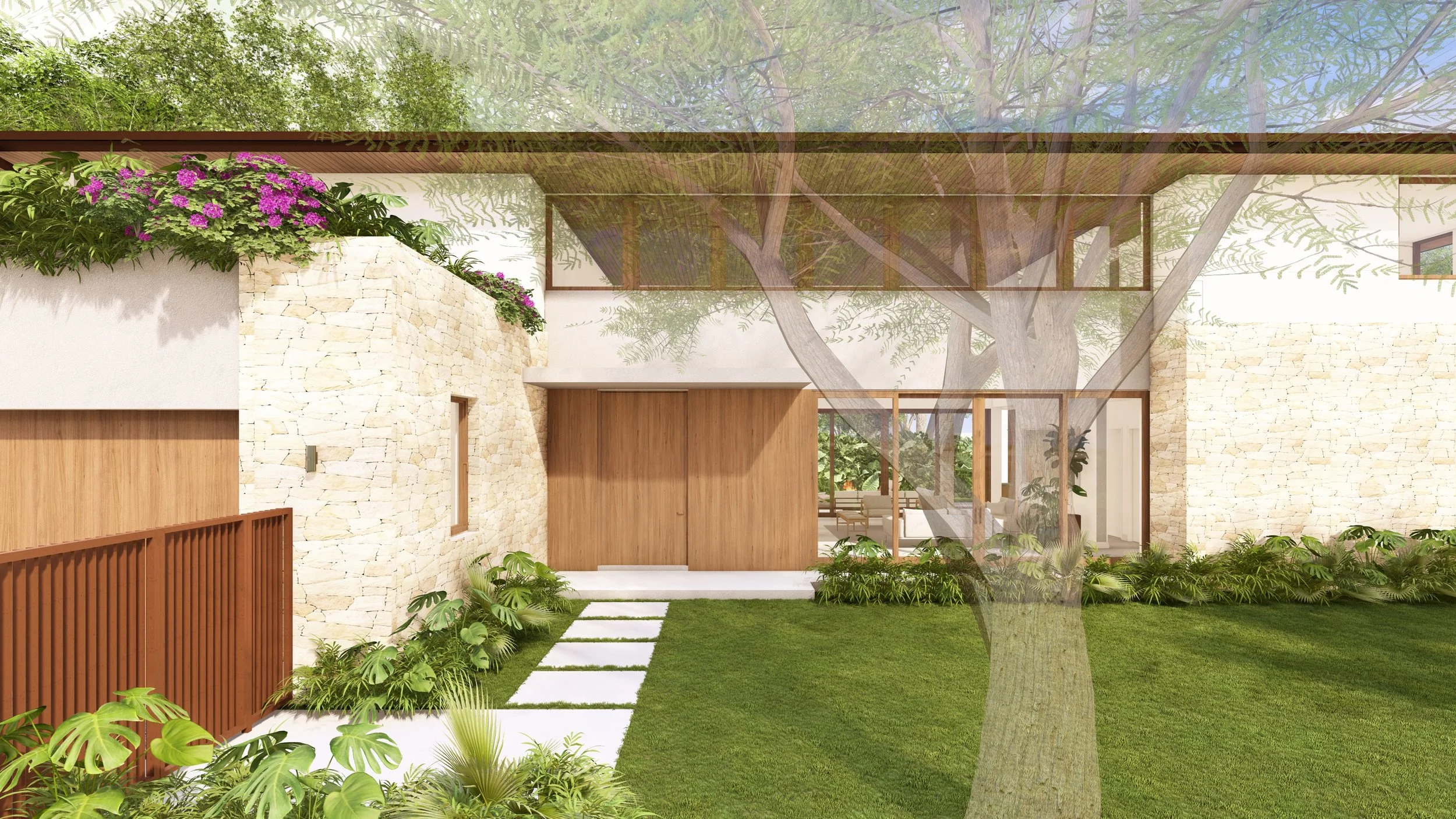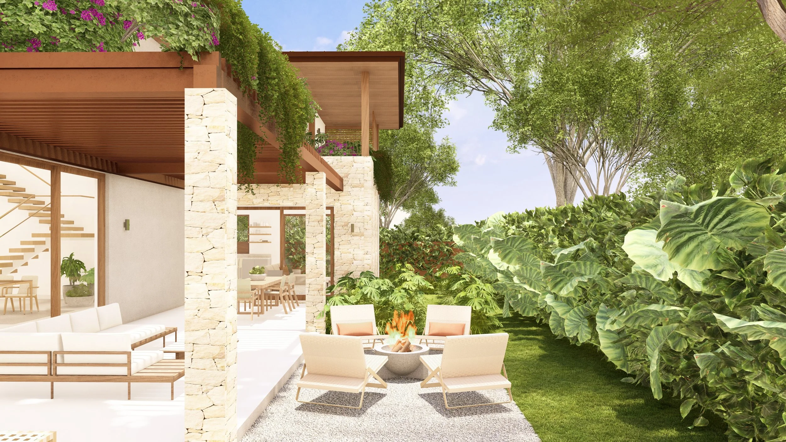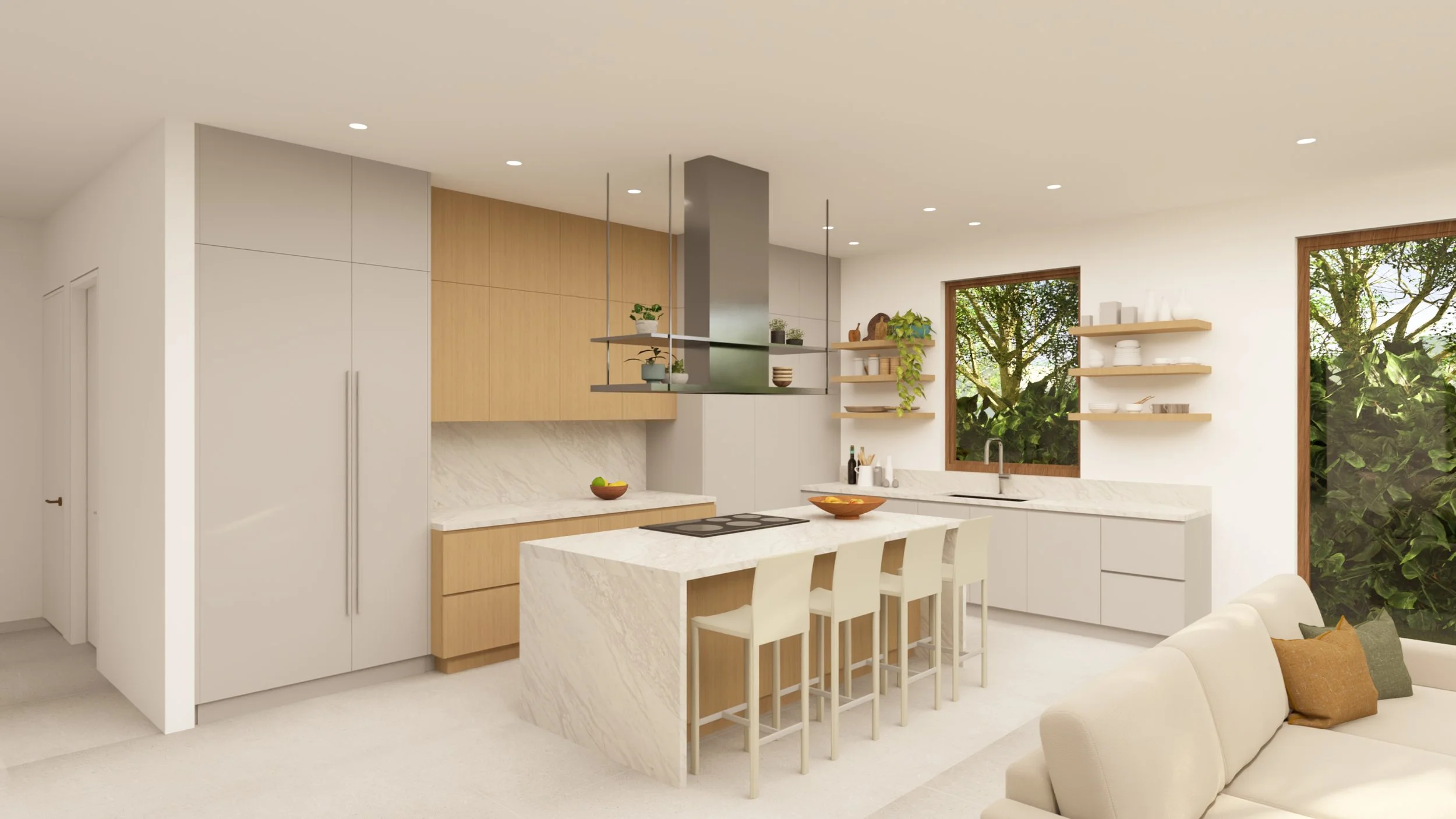 Floor-to-ceiling windows, sliding glass walls, and integrated planters blur the boundaries between interior and exterior spaces. Courtyards and shaded terraces foster a continuous flow with nature, while providing shading and comfort in the Miami tropical climate. The design prioritizes sustainability and integrates the home within the site’s natural topography, creating a tranquil and cohesive living environment.